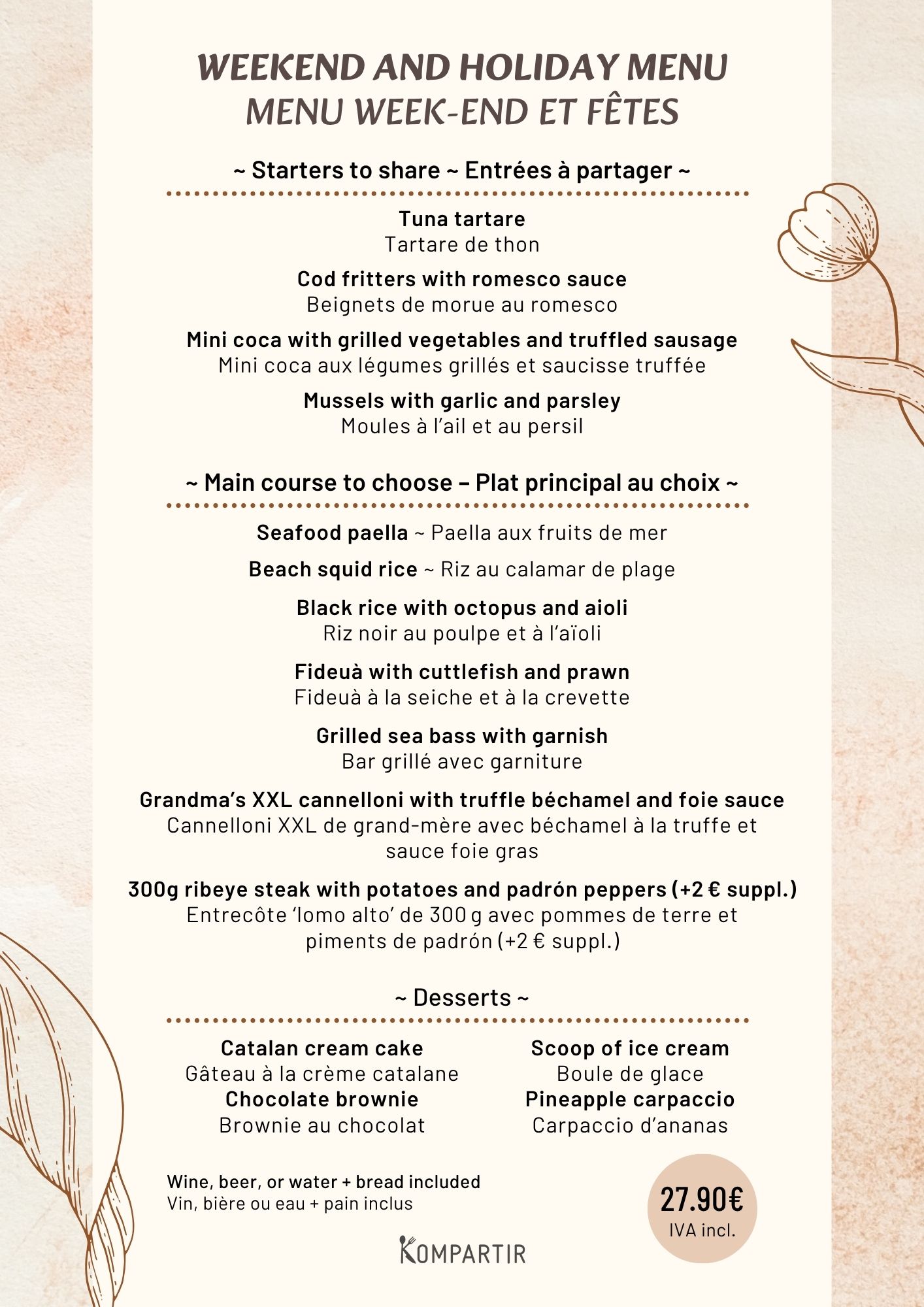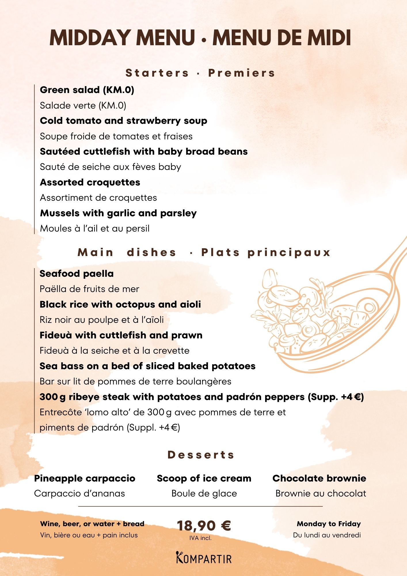 Au Kompartir Gastrotasca de Reus, chaque repas est une célébration des saveurs et des moments partagés. Nous vous invitons à découvrir notre proposition culinaire, où tradition rencontre créativité pour vous offrir une expérience gastronomique inoubliable. Qu’il s’agisse d’une réunion entre amis, d’une fête de famille ou d’un déjeuner rapide, nous vous garantissons une expérience chaleureuse et conviviale.